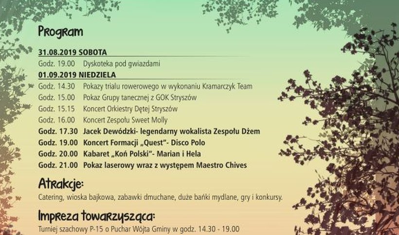 O godz. 17.30 na scenie wystąpi Jacek Dewódzki, wokalista zespołu Dżem, a po nim o godz. 19 grupa disco polo Quest. Wieczorny program o godz. 20 rozpocznie kabaret Koń Polski, a całość zakończy pokaz ogni sztucznych.