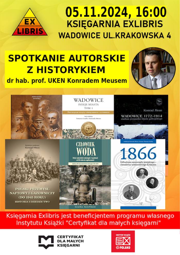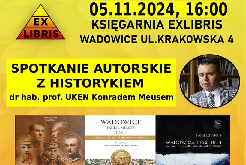Księgarnia Exlibris w Wadowicach zaprasza na spotkanie autorskie z prof. Konradem Meusem, które odbędzie się 5 listopada 2024 roku o godzinie 16:00 w Księgarni Exlibris przy ul. Krakowskiej 4.