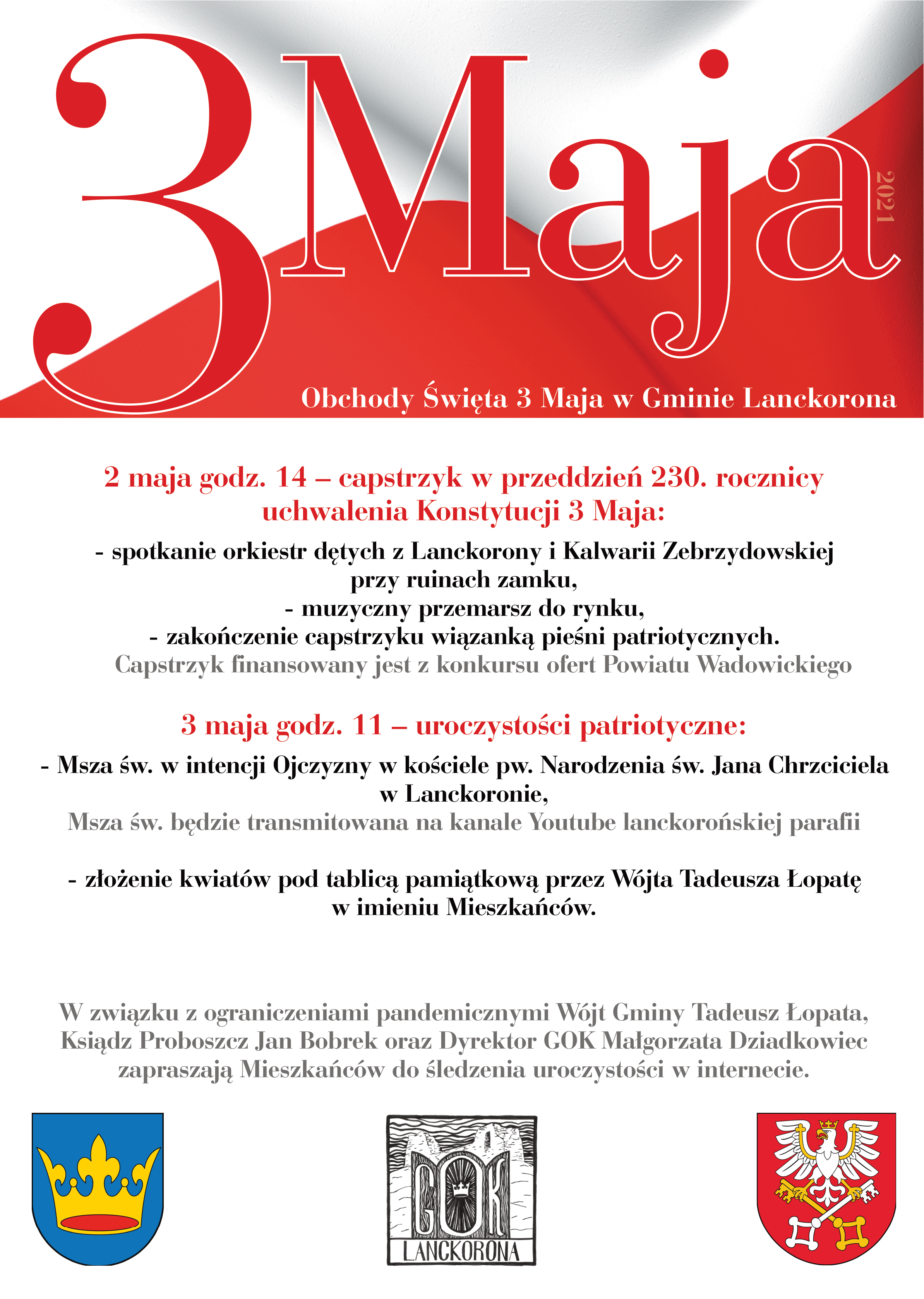 Całość rozpocznie się o godz. 14 w niedzielę przy ruinach zamku. Spotkają się tutaj dwie grupy orkiestr dętych z Lanckorony i Kalwarii Zebrzydowskiej. Po capstrzyku i odśpiewaniu pieśni patriotycznej korowód z orkiestra przejdzie na lanckoroński rynek. W dobie pandemii i zakazu gromadzeń się takie wydarzenie może być widowiskiem w skali całego kraju.