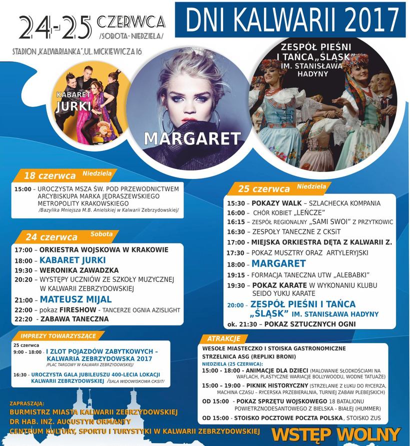 Większość imprez związanych z Dniami Kalwarii na 400-lecie lokacji miasta zorganizowano na stadionie miejskim Kalwarianki oraz w okolicach rynku i w Centrum Kultury Sportu i Wypoczynku. To właśnie na stadionie w niedzielę wystąpi Margaret (godz. 18). Warto jednak pojawić się tutaj wcześniej, ponieważ organizatorzy spodziewają się kilku tysięcy osób na koncercie i może być problem ze znalezieniem miejsc do parkowania w mieście.