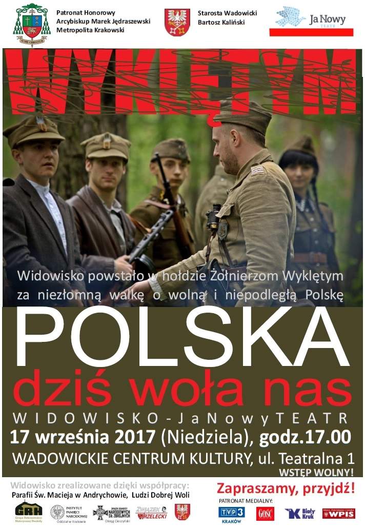 Do Wadowic ponad 80-osobowy amatorski zespół „JaNowego Teatru” (https://www.facebook.com/janowyteatr/) z Andrychowa zaprosił starosta wadowicki Bartosz Kaliński. To z jego inicjatywy w sali teatralno – kinowej WCK aktorzy tego teatru wystawią spektakl pt. „Polska dziś woła nas”. Opowiada on historię zgrupowania partyzanckiego Narodowych Sił Zbrojnych VII Okręgu Śląskiego pod dowództwem kpt. Henryka Flamego ps. „Bartek”. W swoich szeregach skupiał on przede wszystkim młodych ludzi, którzy zapłacili najwyższą cenę za walkę o wolność naszej Ojczyzny. Jesienią 1946 roku podstępem wymordowano ponad stu z nich…