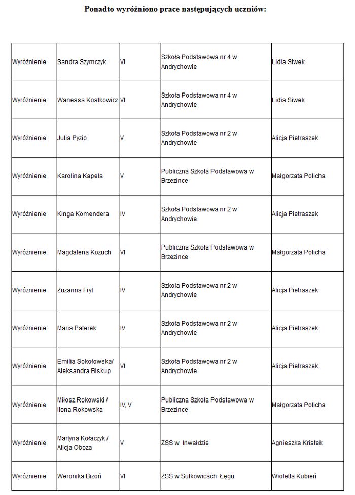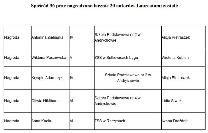 Wszyscy laureaci i wyróżnieni otrzymali z rąk Burmistrza Andrychowa – Tomasza Żak, Z-cy Komendanta Komisariatu Policji w Andrychowie – nadkom. Sławomira Urbanowskiego, kierownika OPS w Andrychowie – Elżbiety Prus oraz kierownika działu profilaktyki OPS – Marty Kajzer okolicznościowe dyplomy oraz nagrody rzeczowe ufundowane przez Policję w ramach realizacji projektu „Zagrożenia w sieci – profilaktyka, reagowanie”, a także przez Dział Profilaktyki OPS Andrychów.
