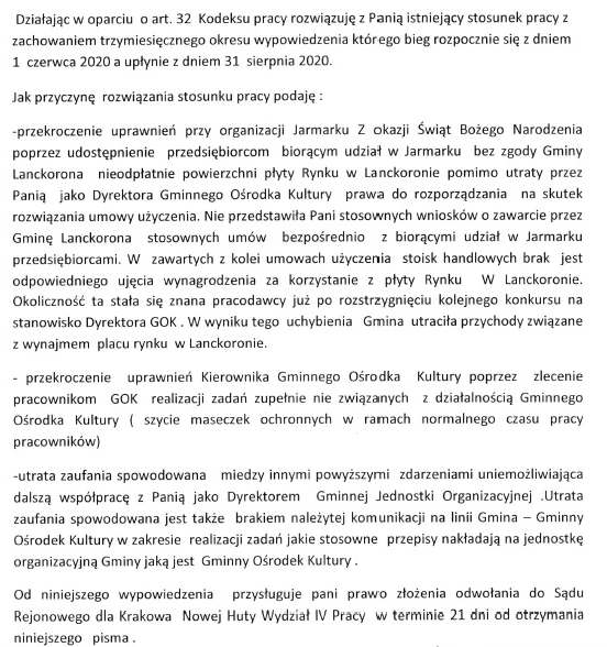 Wójt Tadeusz Łopata w ramach komentarza przysłał skan pisma stanowiącego wypowiedzenie z pracy pani Anny Kani: