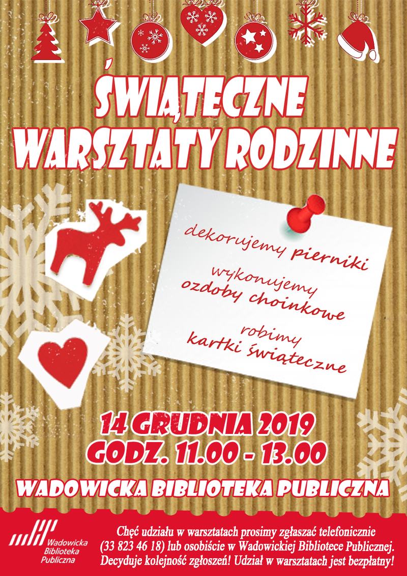 Wadowicka Biblioteka Publiczna zaprasza dzieci w wieku 5-9 lat wraz z opiekunami na Rodzinne Warsztaty Świąteczne, by wspólnie przygotować się do najpiękniejszych świąt w roku. Spotykanie odbędzie się w sobotę 14 grudnia.