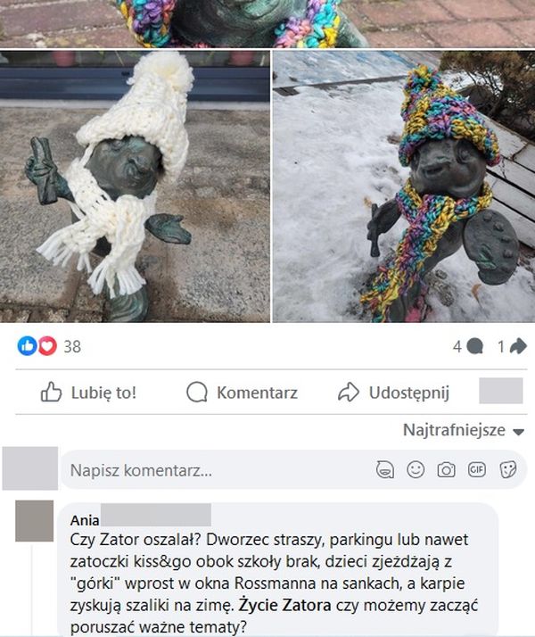 Czy Zator oszalał? Dworzec straszy, parkingu lub nawet zatoczki kiss&go obok szkoły brak, dzieci zjeżdżają z „górki” wprost w okna Rossmanna na sankach, a karpie zyskują szaliki na zimę. Życie Zatora czy możemy zacząć poruszać ważne tematy? – napisała jedna z internautek.