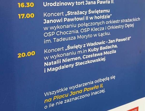 Z okazji obchodów 97. rocznicy urodzin Ojca Świętego Jana Pawła II Urząd Miasta w Wadowicach i Fundacja Pełni Kultury organizują w czwartek na placu Jana Pawła II koncert pt. „ Święty z Wadowic – Jan Paweł II”. Oprócz Czesława Mozila na koncercie ma wystąpić Kuba Badach, Natalia Niemen i Magdalena Steczkowska.