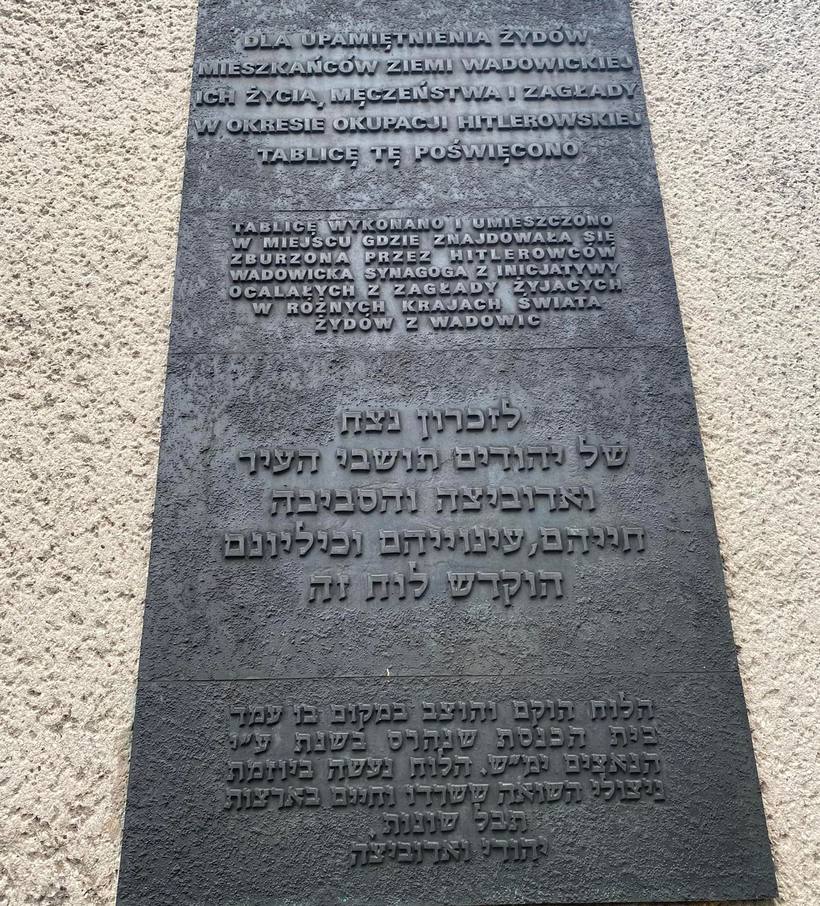 W Wadowicach uczczono pamięć Żydów, pomordowanych w wyniku eksterminacji nazistowskiej. Po ich obecności w mieście niewiele zostało śladów. Jedną z nich jest tablica na budynku dawnej synagogi.