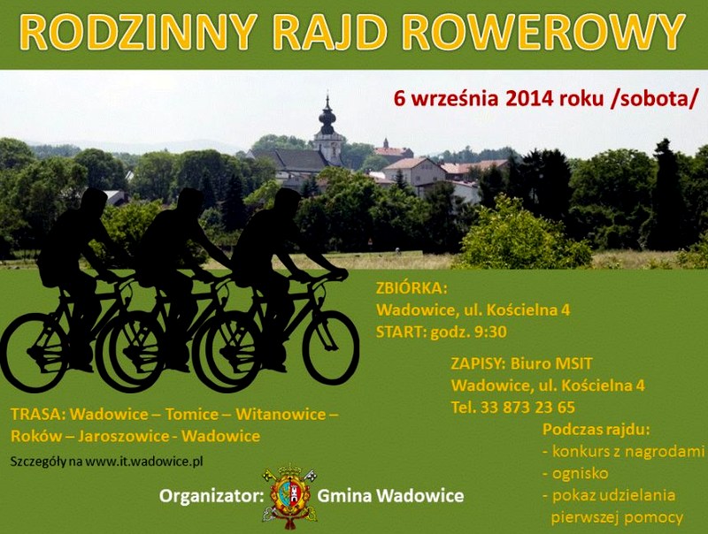 Wydział Organizacji Ruchu Turystycznego Urzędu Miejskiego w Wadowicach organizuje w najbliższą sobotę, 6 września Rodzinny Rajd Rowerowy. Gorąco zapraszamy wszystkich mieszkańców gminy do udziału w rajdzie, który obfitować będzie w wiele atrakcji.