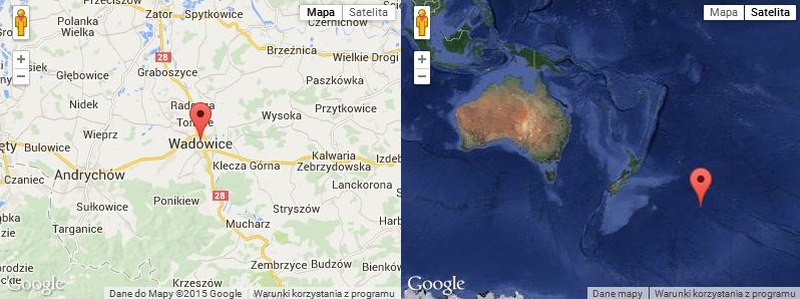 Niestety okazuje się, że dokładnie po drugiej stronie globu niewiele zobaczymy. Jedynie wielką wodę i wzburzone fale. Antypody Wadowic znajdują się bowiem na środku południowego obszaru Oceanu Spokojnego.