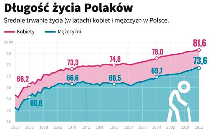 W 2015 r. w Polsce mężczyźni żyli przeciętnie 73,6 lat, natomiast kobiety 81,6 lat – poinformował GUS. W porównaniu z 1990 r. żyjemy jednak dłużej odpowiednio o 7,4 i 6,4 lat.