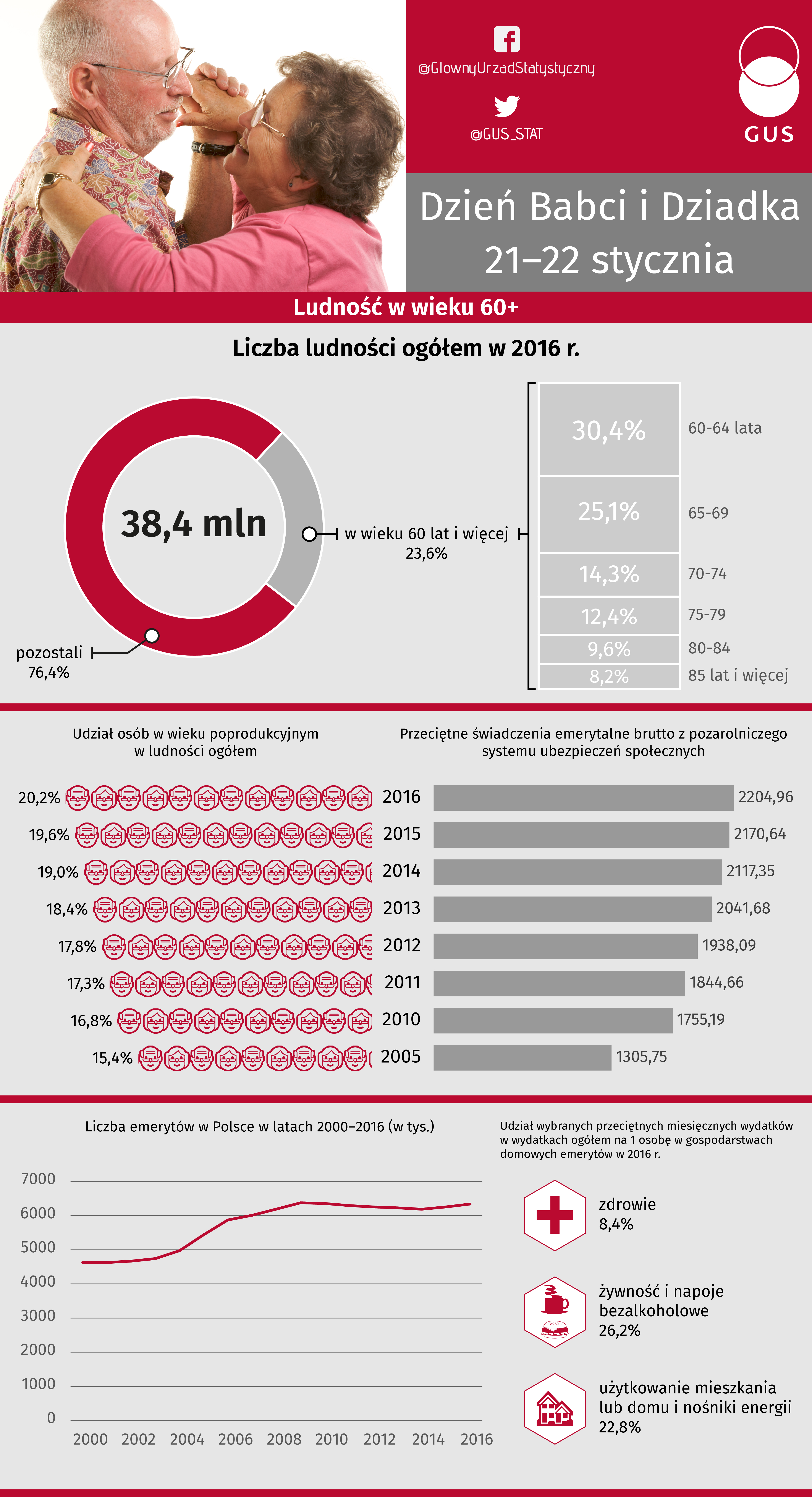 Prawie jedna czwarta ludności Polski to osoby po sześćdziesiątym roku życia. Przeciętne świadczenie emerytalne z ZUS wyniosło w 2016 r. 2205 zł. Z okazji Dnia Babci i Dziadka GUS przygotował najważniejsze informacje o polskich seniorach.
