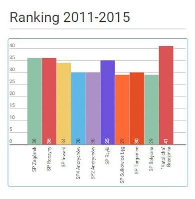 Postanowił więc sprawdzić jak ta statystyka będzie wyglądać za ostatnie 5 lat. Okazało się, że z poprzedniego zestawienia pozostała tylko szkoła z Zagórnika, która uplasowała się na drugim miejscu. Pierwsza, z wyraźnie odstającą od reszty wysoka oceną, jest szkoła katolicka w Brzezince. Trzecie miejsce zajmuje Szkoła Podstawowa w Rzykach.