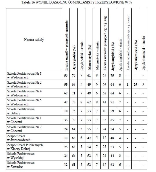 Z wyników 11 szkół należących do gminy Wadowice widać wyraźnie, że lepsze wyniki otrzymywali uczniowie szkół miejskich. Choć w przypadku egzaminu z języka polskiego wysoko uplasowały się także podstawówka z Babicy i „jedynka” z Choczni. Najlepszy wynik, bo 78 % uzyskali uczniowie Szkoły Podstawowej nr 5 w Wadowicach. Za nimi uplasowała się Babica ( 73%), następnie SP nr 4 (71%). Uczniowie z „piątki” byli także najlepsi z matematyki. Ich wynik ukształtował się na wysokości 62%. Na podobnym poziomie była SP nr 1 (61%). Trzecie miejsce w tym rankingu zdobyła Szkoła Podstawowa nr 2 w Choczni (55%). z języka angielskiego najlepsi byli uczniowie ze Szkoły Podstawowej nr 1 w Wadowicach (75%). Zaraz za nimi znaleźli się uczniowie z „piątki” (71%), a następnie młodzież z SP nr 1 w Choczni (65%).