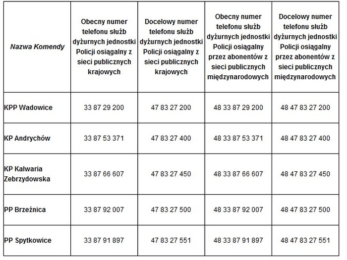 Chcąc dodzwonić się na przykład do Komendy Powiatowej Policji w Wadowicach od 2 lipca trzeba będzie wybrać numer 47 83 27 200. Jak widać z wykazu wszystkich kontaktów opublikowanych przez wadowickich policjantów, numery zmieniają nie tylko „kierunkowy”.