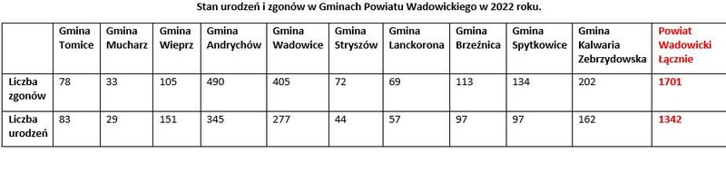 Jak poinformował nas Sebastian Mlak, rady powiatu wadowickiego, w gminach powiatu, w 2022 roku, zmarło 1701. Liczba urodzeń była o wiele niższa i wyniosła 1342 osoby.