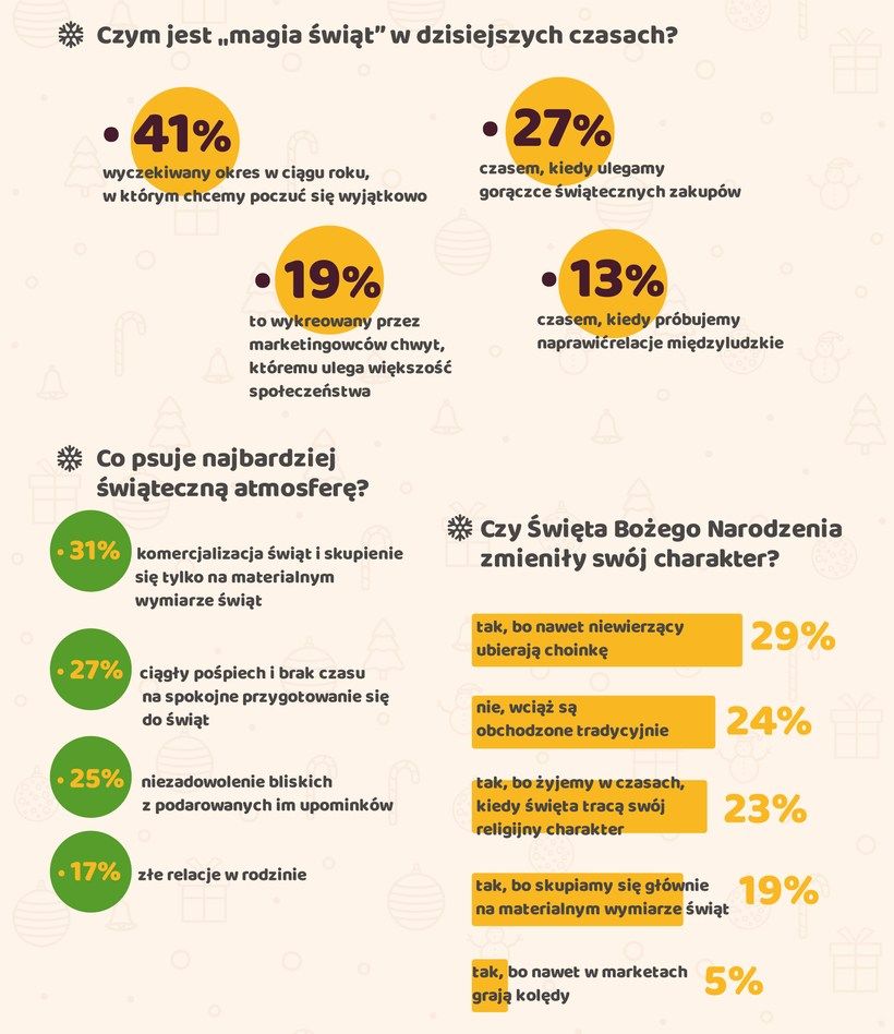 Świąteczną atmosferę najbardziej psuje zdaniem 31% zapytanych komercjalizacja Bożego Narodzenia i skupienie się na materialnym wymiarze oraz zdaniem 27% ankietowanych ciągły pośpiech i brak czasu na spokojne przygotowanie się do Wigilii. Dla 25% Polaków złe samopoczucie powoduje niezadowolenie bliskich z podarowanych im prezentów, a dla 17% złe relacje w rodzinie.