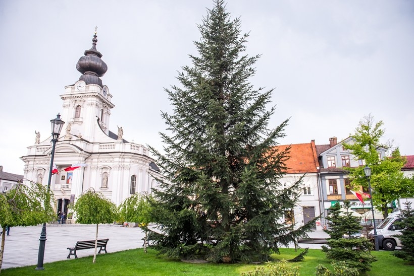 Drzewko, choć ścięte na początku grudnia 2015 roku i przywiezione z lasu w Jaroszowicach, dzielnie stoi wbite w jeden z trawników rynku, a jego igiełki powiewają radośnie na majowym wietrze.