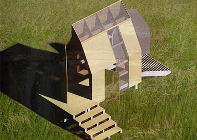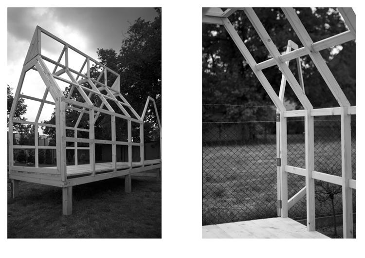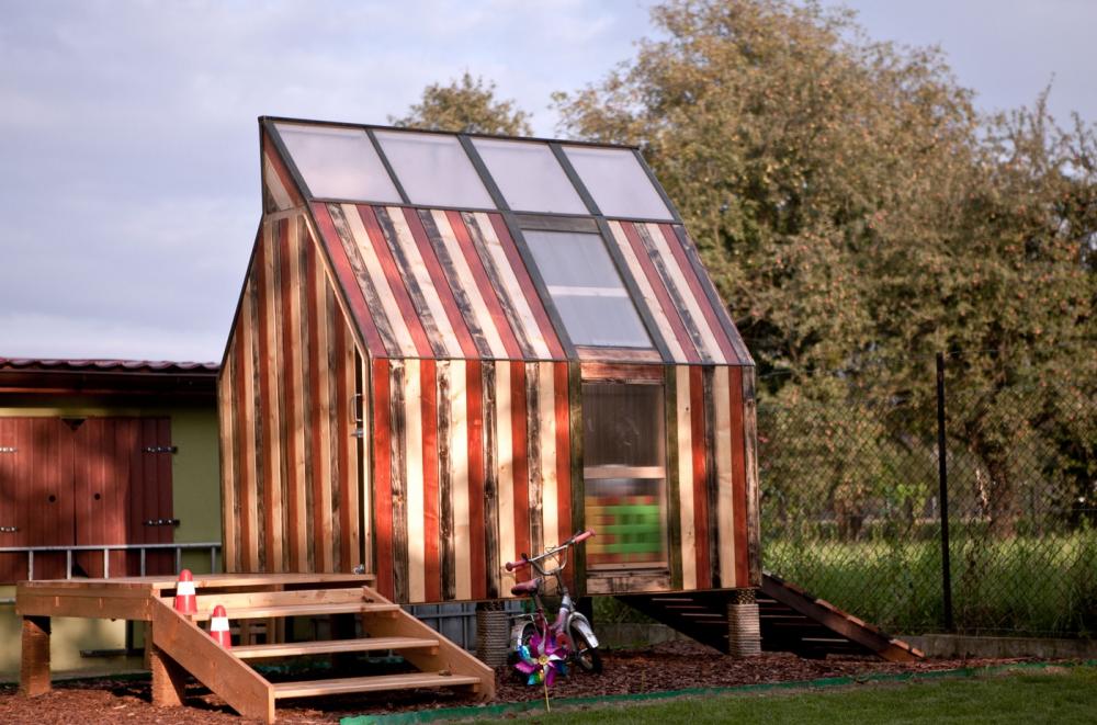 Domek został więc posadowiony nie na gałęziach, ale na dziewięciu słupkach, dzięki czemu choć trochę unosi się nad ziemią. To było dla Karola bardzo ważne, bo bryła miała przypominać prawdziwą rakietę kosmiczną, a jednocześnie kredkę. Rakietka Domek Kredka – to obiekt o niewielkiej skali. Ma 9 m2 powierzchni, został zbudowany z drewna.