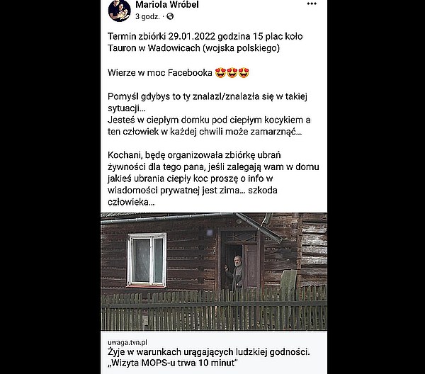 Co ciekawe bohater reportażu sam na nic się nie skarżył i nie ma do nikogo pretensji. Nie on też upominał się o zainteresowanie, ale jedna z „aktywistek”, która przechodziła obok chaty wracając z wycieczki.