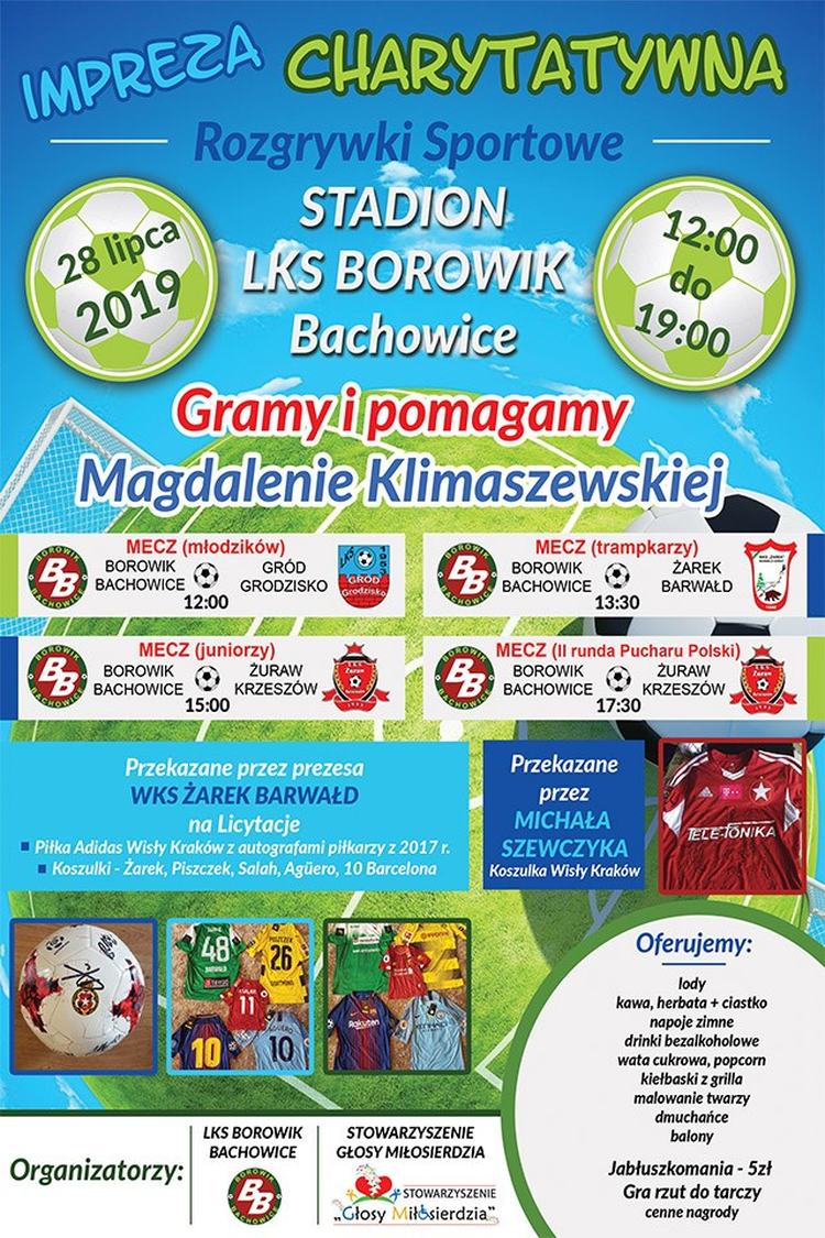 Charytatywne rozgrywki sportowe odbędą się w godzinach od 12. do 19. na stadionie LKS Borowik w Bachowicach. Wszyscy są zaproszeni.