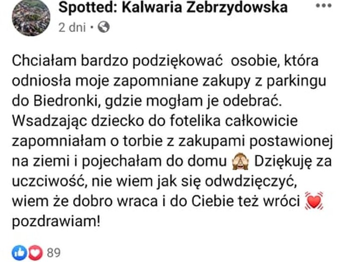 Chciałam bardzo podziękować osobie, która odniosła moje zapomniane zakupy z parkingu do biedronki, gdzie mogłam je odebrać. Dziękuję za uczciwość, nie wiem jak się odwdzięczyć, wiem, że dobro wraca i do Ciebie też wróci. Pozdrawiam – napisała na Spotted: Kalwaria Zebrzydowska kobieta.