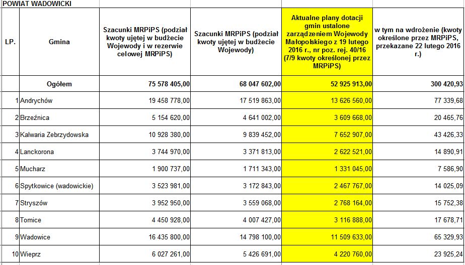 Do powiatu wadowickiego trafi w tym roku 52,9 mln zł, z czego największe dotacje otrzymają gminy, w których liczba osób uprawnionych do pobierania zasiłków jest największa, czyli do Andrychowa 13,6 mln zł i Wadowic 11,6 mln.