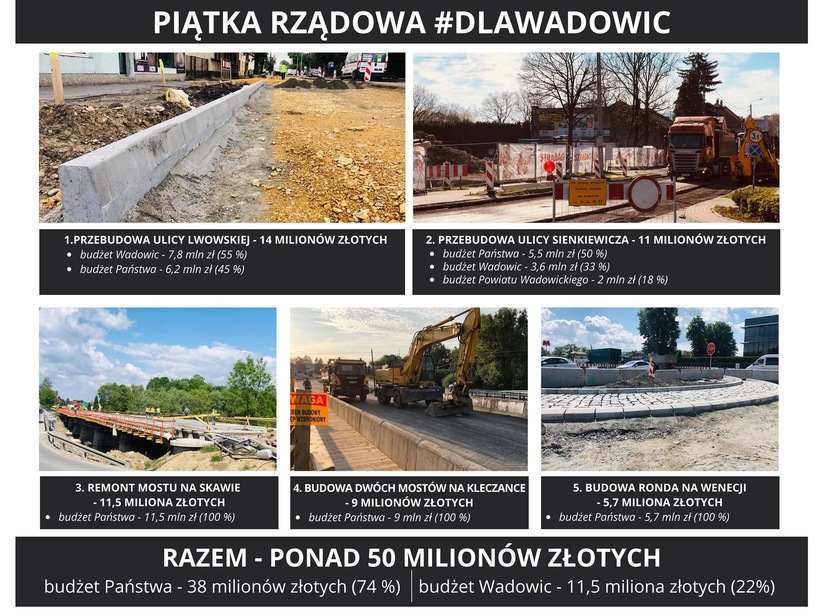Aktualnie na terenie naszej gminy odbywa się pięć ogromnych, wielomilionowych inwestycji. Wszystkie finansowane bądź współfinansowane z budżetu Państwa w łącznej kwocie aż 38 milionów złotych! Jeśli dodamy do tego wpisaną w rządowy program budowę wadowickiej obwodnicy za blisko 70 mln zł, wychodzi na to, że rząd przeznaczył na infrastrukturę drogową w Wadowicach już grubo ponad 100 milionów złotych. Tak można rozwijać Wadowice, a to dopiero początek – komentuje Bartosz Kaliński na portalu społecznościowych.