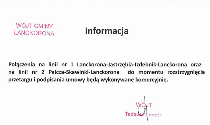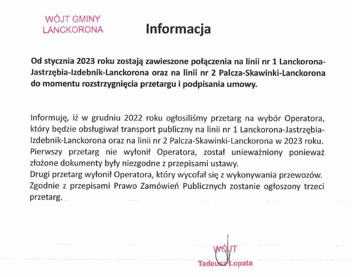 Samorząd na początku roku poinformował o zawieszeniu połączeń na wspomnianych liniach. Natomiast 10 stycznia, na urzędowym Facebooku pokazał się komunikat mówiący, że „do czasu rozstrzygnięcia przetargu i podpisania umowy połączenia busowe na liniach nr 1 i nr 2 od dnia 10.01.2023 r. będą wykonywane komercyjnie”.