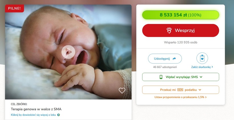 Zbiórka na najdroższy lek świata Zolgensma, który kosztuje 10 mln zł, rozpoczęła się w lipcu tego roku. Na konto fundacji swoje pieniądze przelało ponad 120 tysięcy osób.