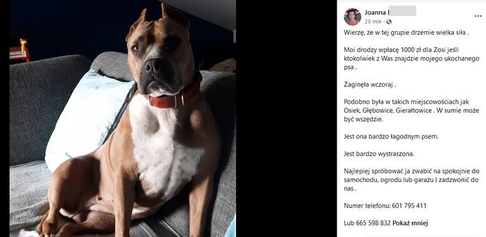 Wierzę, że w tej grupie drzemie wielka siła. Moi drodzy wpłacę 1000 zł dla Zosi jeśli ktokolwiek z Was znajdzie mojego ukochanego psa – czytamy na stronie Facebook/ Armia Oliwierka wspiera Zosię.