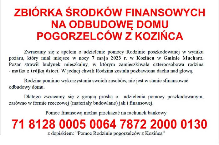 Dodatkowo uruchomiono specjalne konto, na które można wpłacać pieniążki z dopiskiem „Pomoc Rodzinie pogorzelców z Kozińca”.