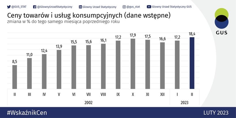 W lutym 2023 roku ceny towarów i usług konsumpcyjnych wzrosły w porównaniu do lutego 2022 r. o 18,4 proc. (przy wzroście cen towarów – o 20,2 proc. i usług – o 13,3 proc.) – czytamy w komunikacie GUS.