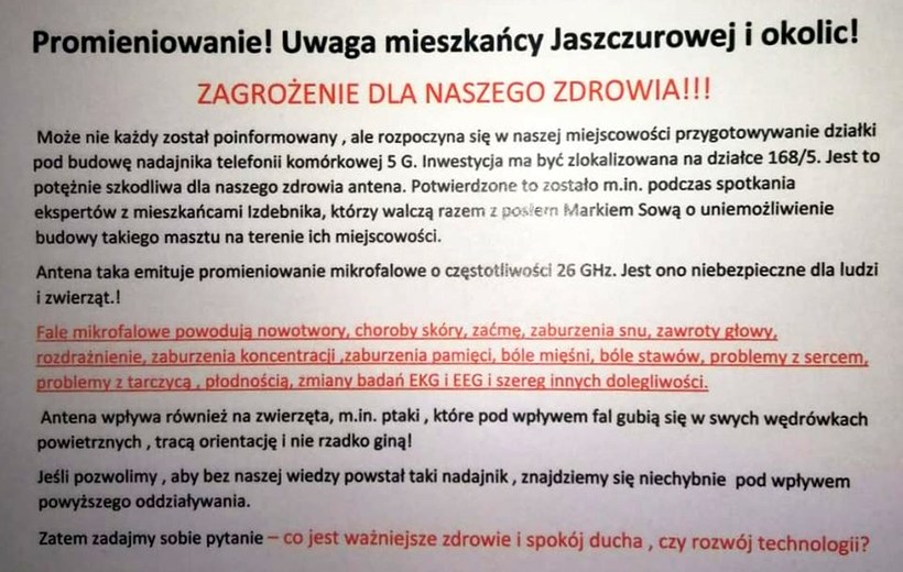 Jaszczurowa to nie Warszawa, Łódź, czy Katowice i żaden z operatorów nie ma zamiaru inwestować tutaj w najwyższą technologię dla kilkudziesięciu domów. A już na pewno nie w technologię w paśmie 26 Ghz, która zarezerwowana jest dla przestrzeni wysokozurbanizowanych, a której tak obawiają się autorzy ulotki.