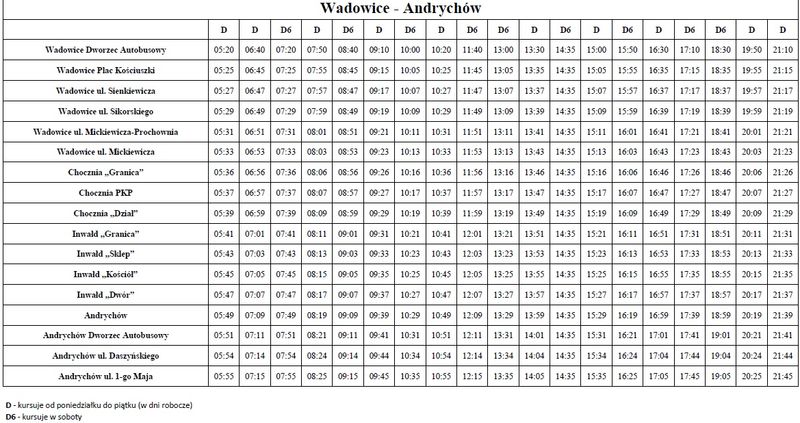 Teraz możemy poznać dokładny rozkład jazdy pełnowymiarowego autobusu. Pierwszy kurs z Wadowic wyjedzie z dworca autobusowego o godz. 5:20 ostatni o 21:10. Natomiast z Andrychowa do Wadowic pierwszy kurs wyruszy o 4:45, a ostatni o 20:30.