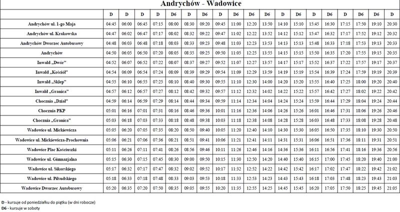 Jest dokładny rozkład jazdy autobusu na trasie Andrychów – Wadowice – Andrychów