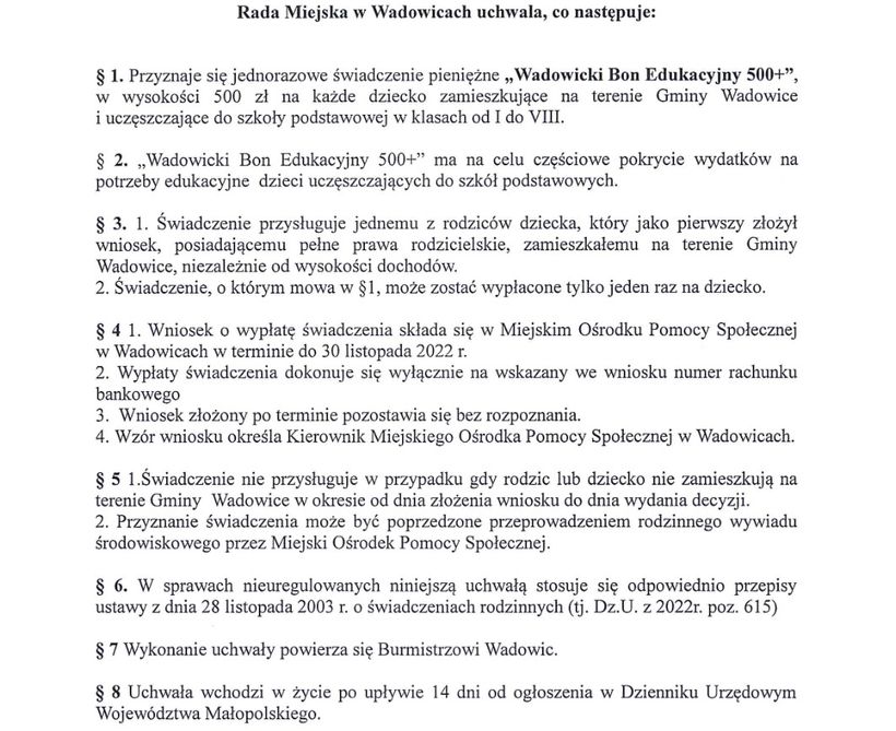 Uchwalona w tym tygodniu regulacja Rady Miejskiej w Wadowicach o wypłacie 500 zł rodzicom musi jeszcze przejść procedurę w Urzędzie Wojewódzkim. Uchwała uprawomocni się po 14 dnia po opublikowaniu w Dzienniku Urzędowym Województwa Małopolskiego.