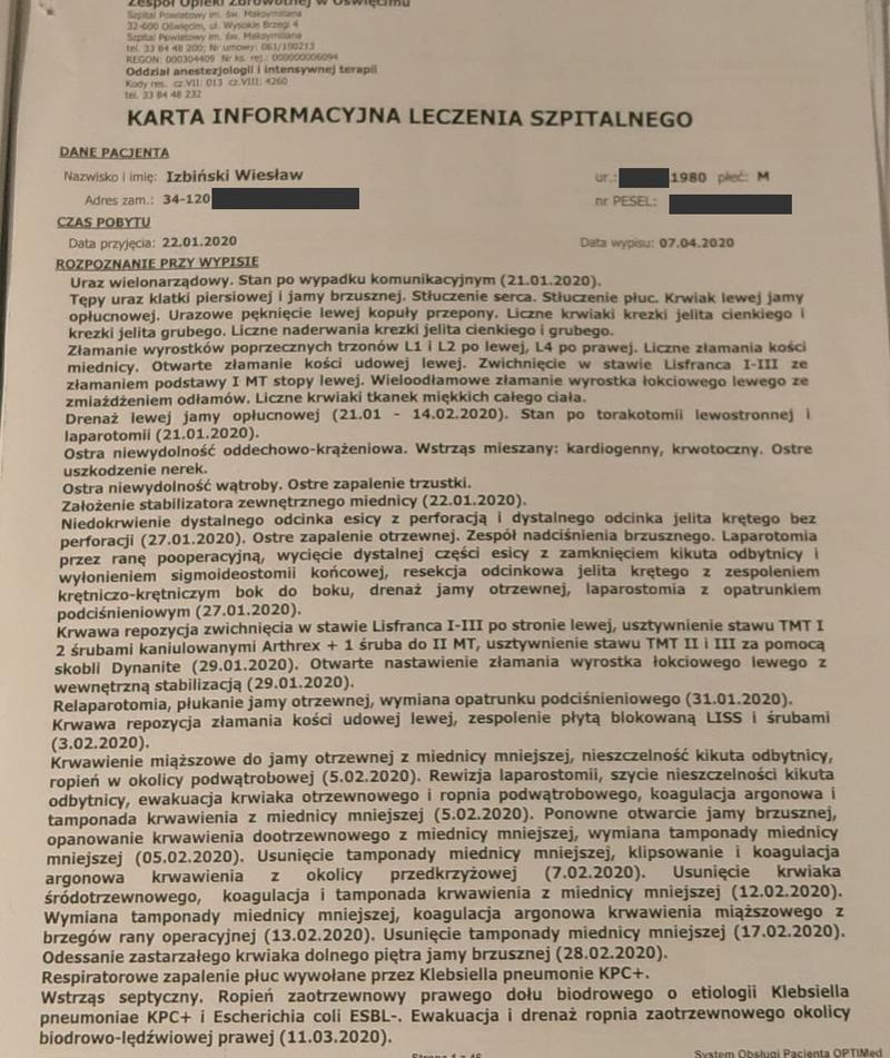 Karta wypisu ze szpitala opisuje jak małe szanse na życie miał pan Wiesław.