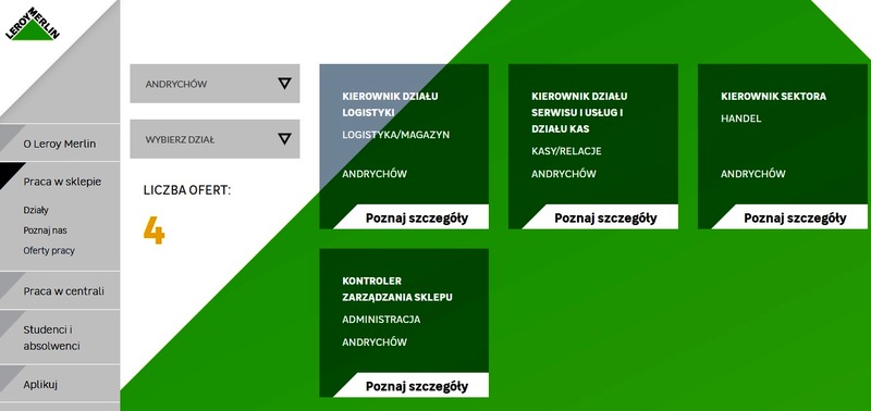 Pierwsze sklepy rozpoczęły rekrutację. Leroy Merlin szuka pracowników na cztery stanowiska: kierownik działu logistyki, działu serwisu i usług, działu kas, kierownik sektora handlu oraz kontrolera zarządzania sklepem. [fot. screen ze strony LeroyMerlin]