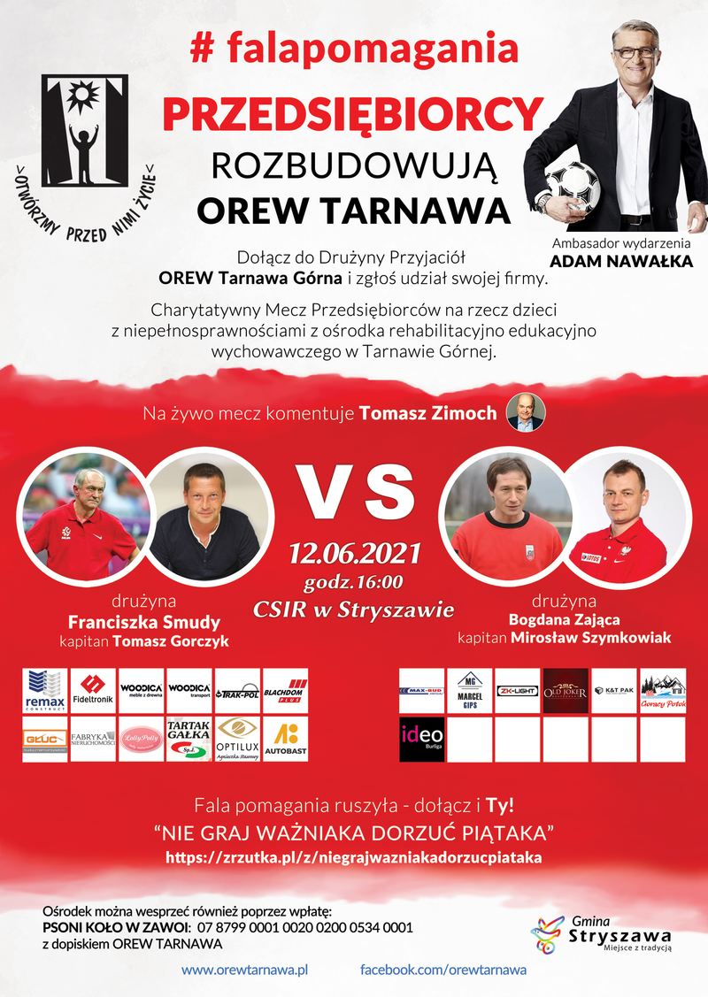 Przedstawiciele lokalnych firm pod przewodnictwem piłkarskich gwiazd staną do sportowej rywalizacji 12 czerwca 2021 roku w Centrum Rekreacji i Sportu w Stryszawie. Będzie to charytatywny mecz przedsiębiorców o Puchar Starosty Suskiego na rzecz dzieci z niepełnosprawnościami z OREW W Tarnawie Górnej.