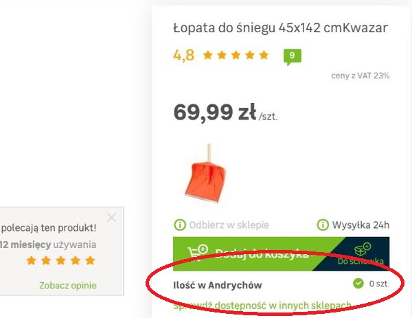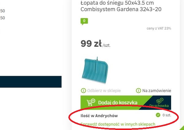 Nawet w Leroy Merlin w Andrychowie nie można dostać łopaty do odśnieżania. Potwierdza to strona internetowa sklepu. Stany zerowe dotyczą co najmniej kilku z bardziej budżetowych łopat.