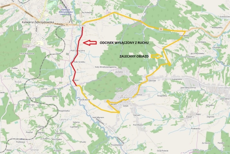 Od poniedziałku (25.05) odcinek o długości ok. 2 km od granicy miejscowości Lanckorona i Brody do skrzyżowania z drogą krajową nr 52 zostanie wyłączony z ruchu.