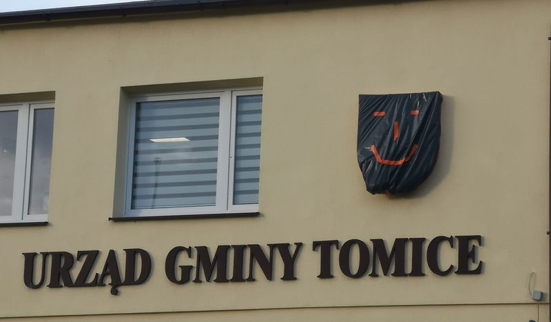 Jakiś czas temu na herbie Tomic znajdującym się na budynku gminy, pojawił się czarny worek, na którym przyklejono pomarańczową taśmę.