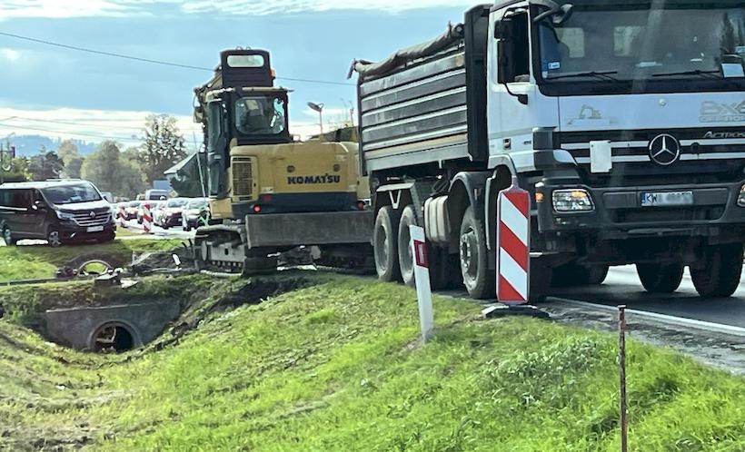 W związku z pracami, pas drogi w kierunku Wadowic został zablokowany. Pracownicy budowy kierowali ruchem ręcznie.