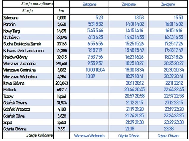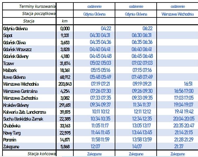 Na zatwierdzonej trasie, od 10 grudnia 2023 r. do 9 grudnia 2028 r., PKP Intercity będzie mogło uruchamiać codziennie 3 pociągi na dobę w relacji Gdynia Główna – Zakopane, na odcinkach: Gdynia Główna – Zakopane – Gdynia Główna, a także Warszawa Wschodnia – Zakopane – Warszawa Wschodnia.