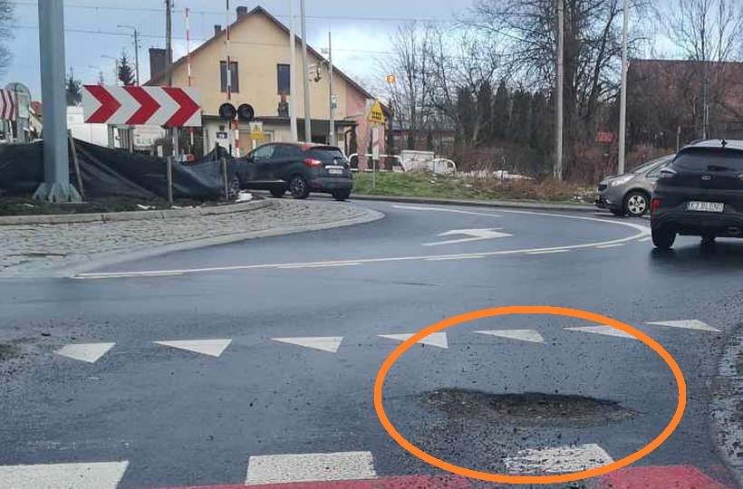 Nadeszła odwilż i krajobraz zaczął się zmieniać. Tak duże zmiany w temperaturach wystawiają na próbę nawierzchnie asfaltowe jezdni. W wielu miejscach, tak jak, chociażby na zdjęciu głównym, czyli ulicy Wojska Polskiego w Wadowicach, wyrwa w drodze może być naprawdę głęboka i trudno ją ominąć.