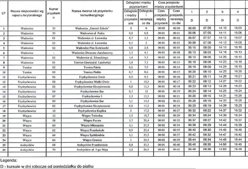 Szczegóły dotyczące godzin odjazdów z poszczególnych przystanków można znaleźć także w rozkładzie jazdy zamieszczonym w Biuletynie Informacji Publicznej Starostwa Powiatowego w Wadowicach TUTAJ.