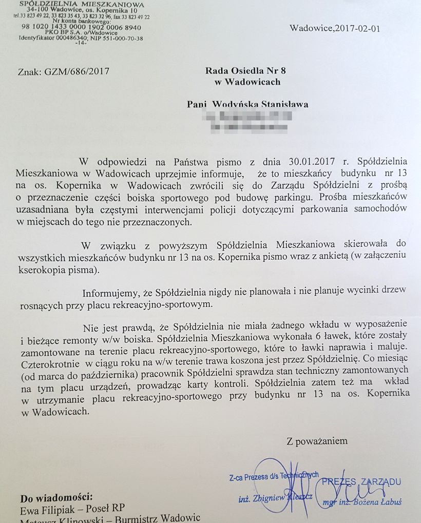 Jak pisze w swoim piśmie Spółdzielnia Mieszkaniowa, o takie rozwiązanie wnioskowała część mieszkańców tegoż bloku. Chodziło o przeznaczenie części istniejącego terenu rekreacyjnego tuż pod blokiem.