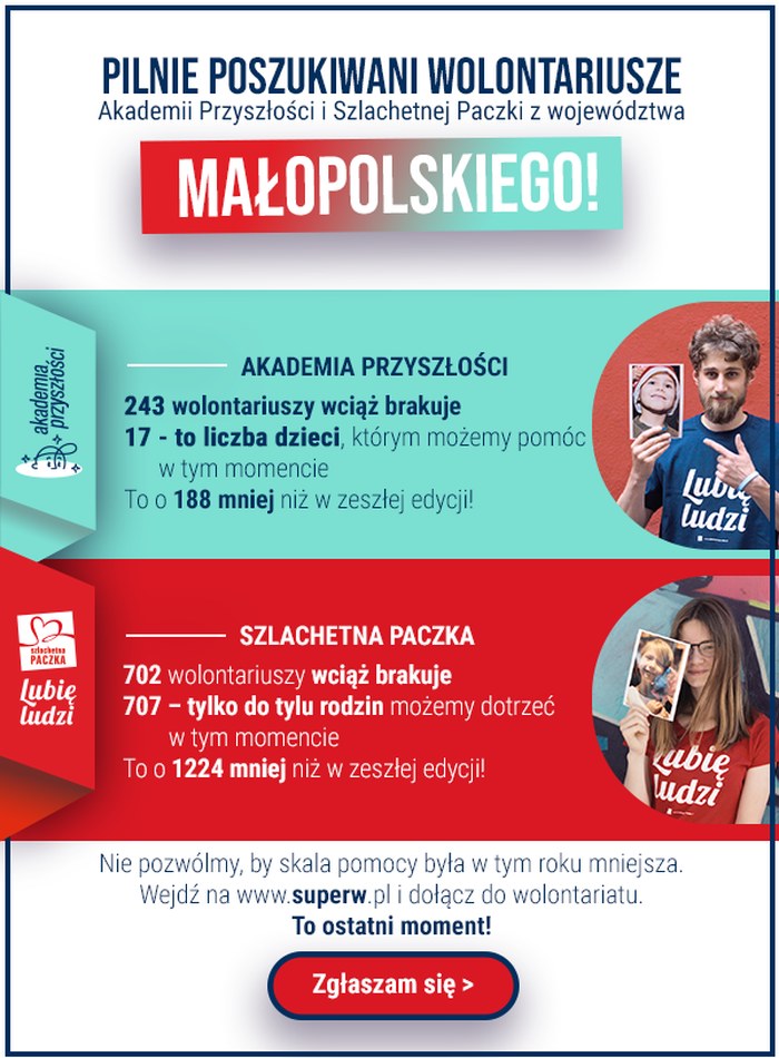 Szlachetna Paczka i Akademia Przyszłości pilnie poszukują wolontariuszy w województwie małopolskim. Brakuje prawie 1000 osób. To już ostatni moment, by się zgłosić. Rekrutacja potrwa jeszcze tylko dwa tygodnie.
