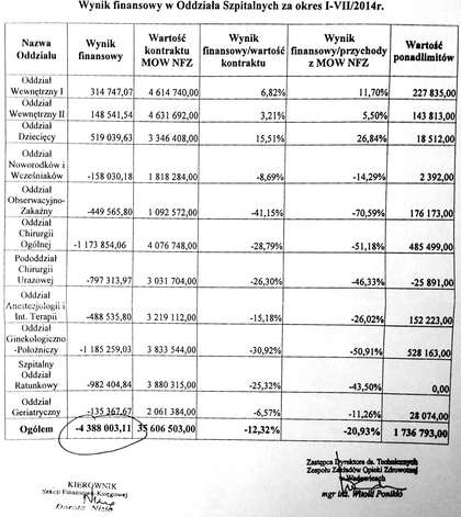 Dokument określa wynik finansowy w oddziałach szpitalnych od stycznia do lipca tego roku. Wynika z niego, że lecznica zanotowała w tym czasie wysoką stratę… aż 4,388 miliona złotych. To efekt przekroczenia kontraktu z Narodowym Funduszem Zdrowia na ośmiu z jedenastu oddziałów lecznicy.