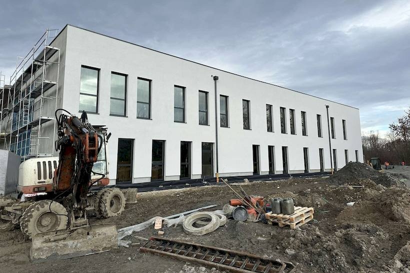 Budynek jest już częściowo ocieplony, otynkowany i wyposażony w okna oraz bramy.